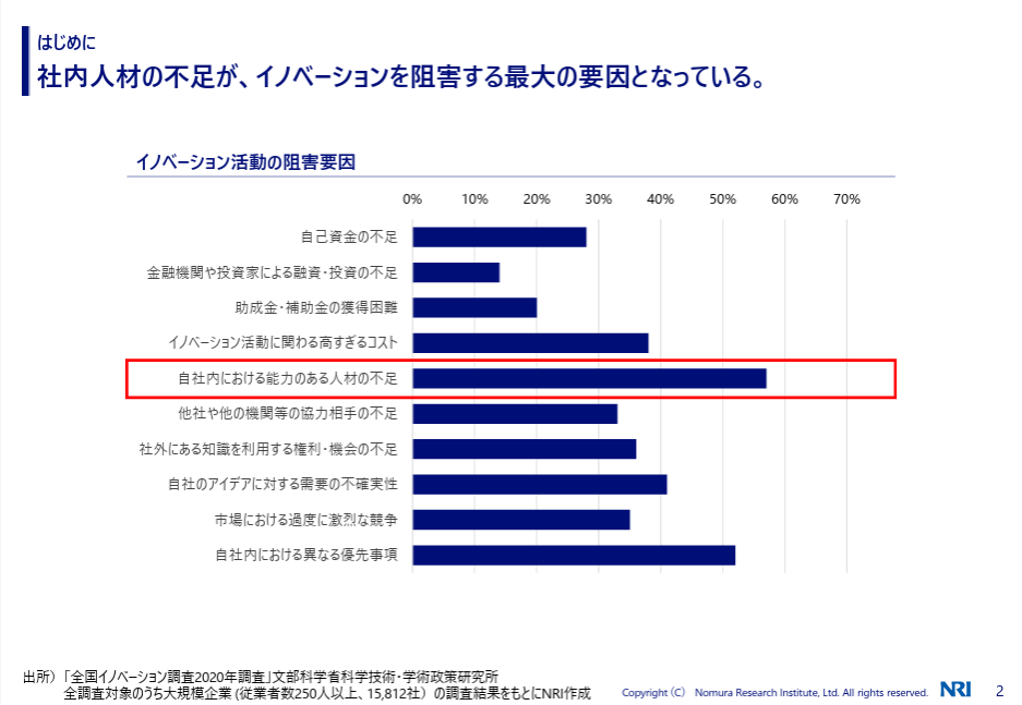 2022年6月に野村総研が発表したアンケート調査によれば、イノベーション活動の阻害要因としてもっとも大きなものとして、「自社内における能力のある人材の不足」があげられており、その傾向はこの3年強でさらに深刻化していることが容易に想像できます。
