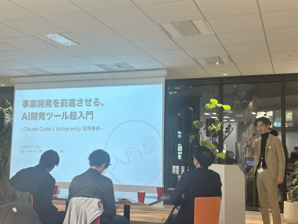 2026年3月19日、当社の親会社である株式会社エージェントのセミナースペースにて、同じグループ会社であるanyenv社との共催で、「事業開発を前進させる、AI開発ツール超入門 – Claude Code / Antigravity実際の活用事例を紹介 – 」と題したセミナーを開催しました。