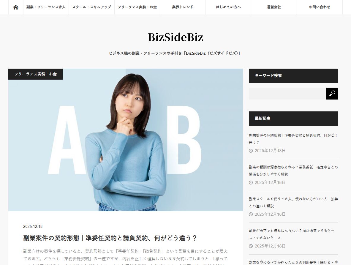「BizSideBiz(ビズサイドビズ)」は、副業やフリーランスを成功談や理想論で語るのではなく、判断に必要な材料を揃え、自分のリスク許容度の中で選択できる状態をつくることを目的としています。