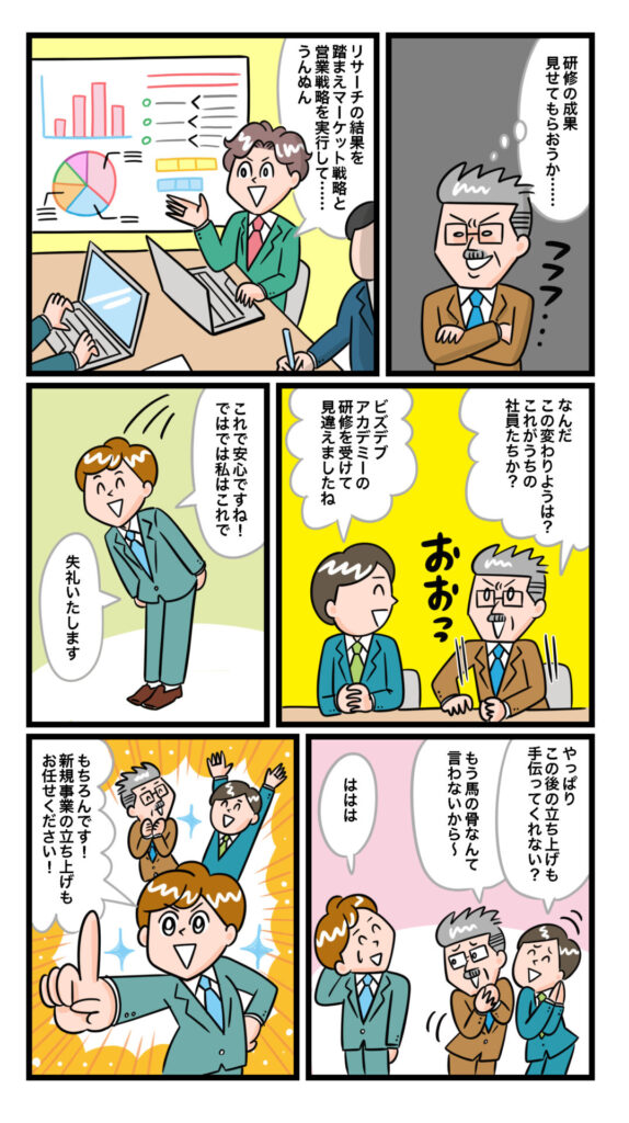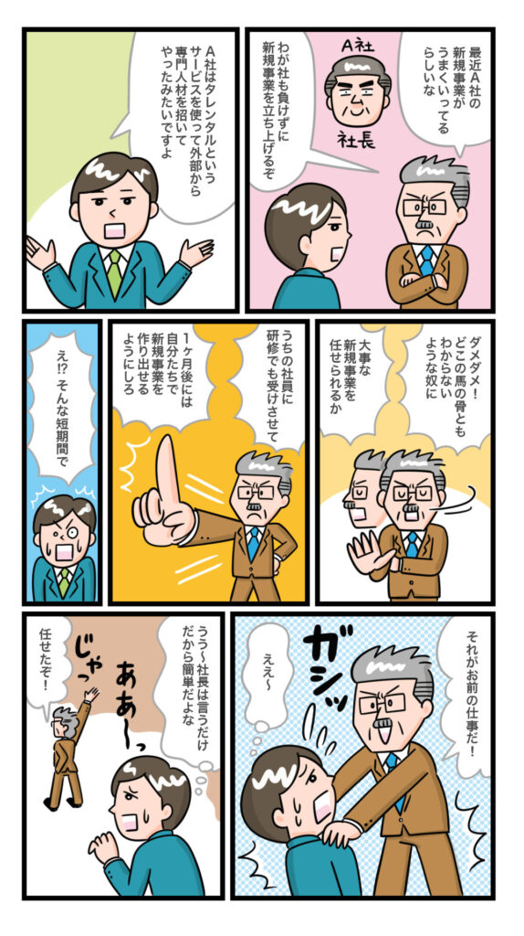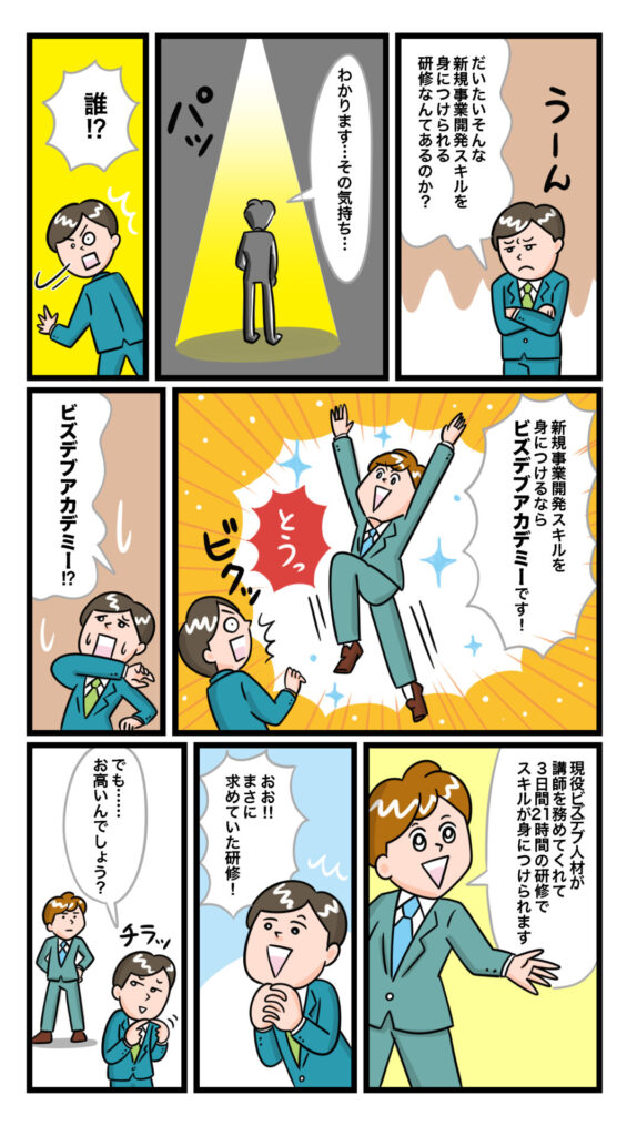 12月にリリースした企業向け研修プログラム「BizDev(ビズデブ)アカデミー」について、マンガでわかるサービス案内を作成しました。サービスサイトと合わせて、ぜひご覧ください。登場するA社は、以前talentalを活用して新規事業に成功した会社です。今回ライバル会社のB社も新規事業に挑戦することを決意したようですが、外部人材の活用には消極的な様子です。さて…。