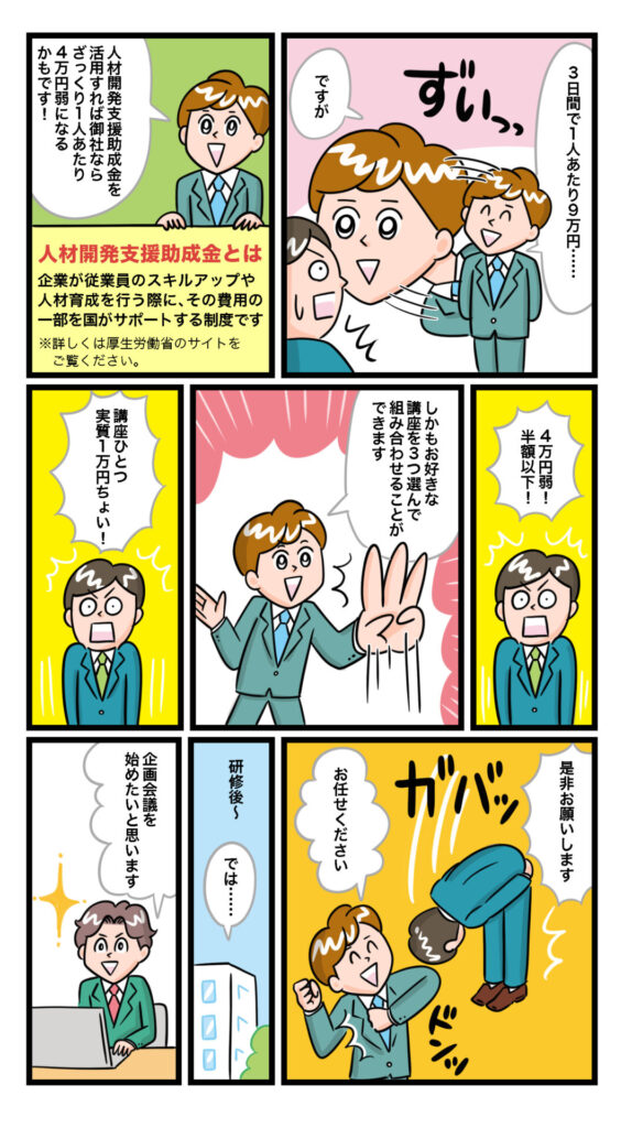 マンガを読んでご興味を持っていただいた企業様は、こちらからお問い合わせください。人材開発支援助成金の活用についても丁寧に説明しますので、お気軽にご相談くださいませ。
