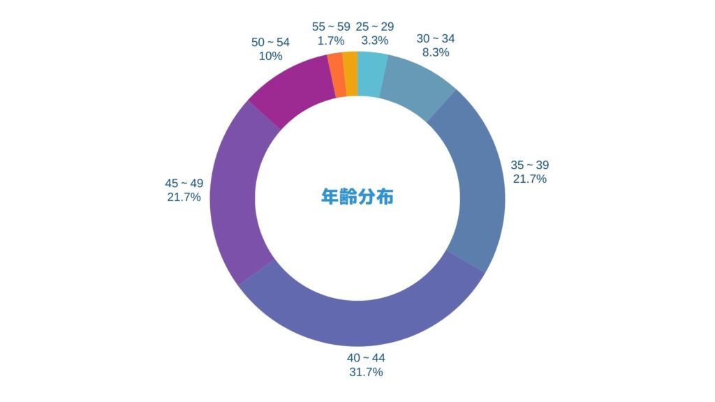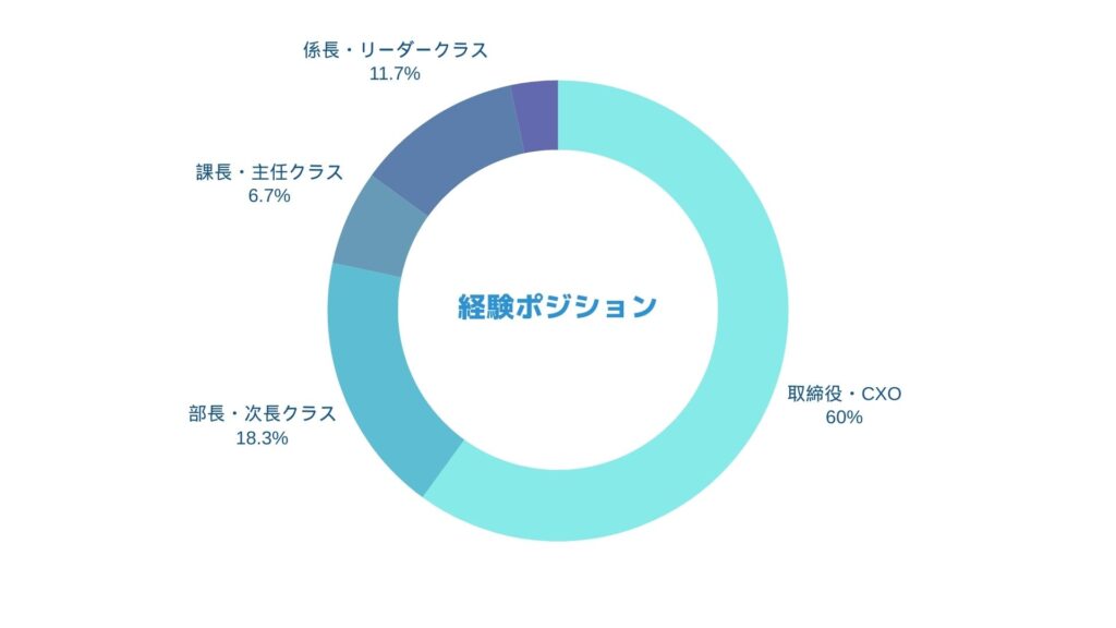会社員の方の登録が増えてきていることに伴い、経験ポジションの分布も少し変化が見られます。前回調査では「取締役・CxO」経験者が7割近くになっていましたが、今回のデータでは60%となっています。しかしながら、「部長・次長クラス」と「取締役・CxO」の合計で78.3%と8割近くになっていますので、マネジメント経験のある方が多いデータベースとなっているかと思います。