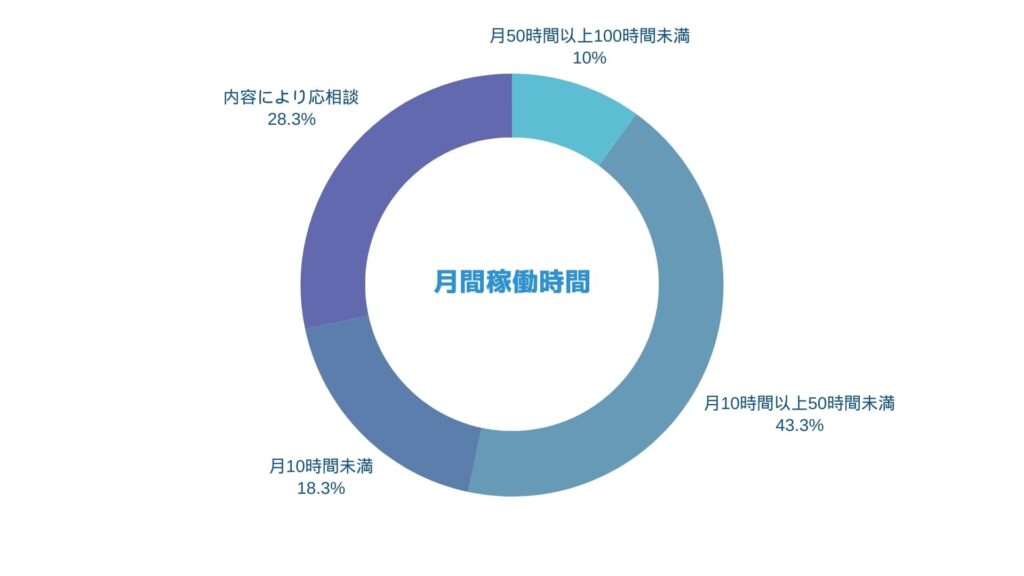 当社に登録している方がどの程度の稼働ボリュームを期待しているかという点では、大きく変化はありません。「月10時間以上50時間未満」が43.3%となっており、実際に開始しているプロジェクトにおいてもこのボリュームでの稼働がほとんどとなっています。副業としての参画がメインですので、いきなり100時間稼働などはやはり難しいため、引き続きこのボリュームがメインになると思われます。