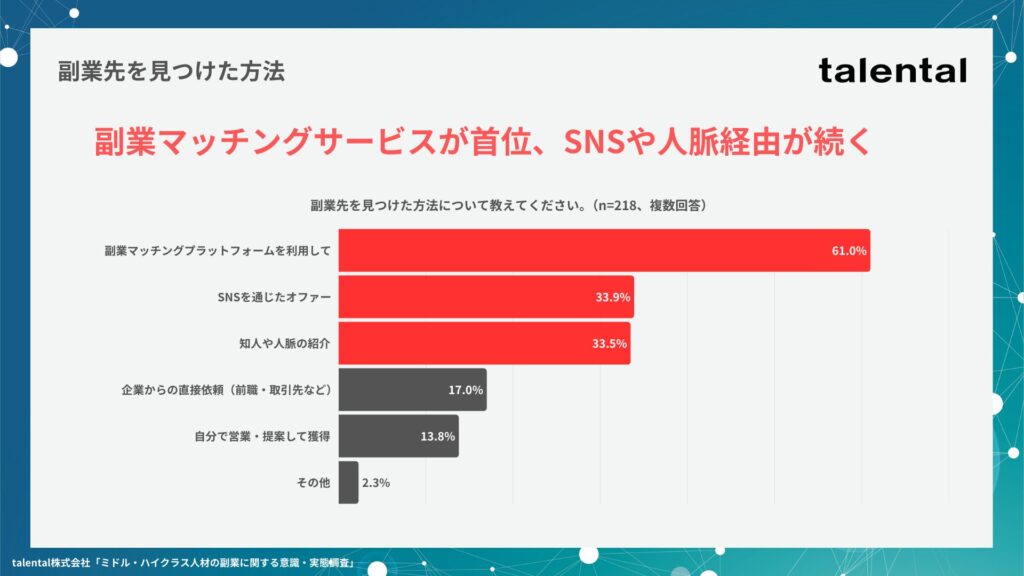 副業先を見つけた方法については、「副業マッチングサービス」が1位で61.0%、次いで「SNSを通じたオファー」「知人や人脈の紹介」となりました。