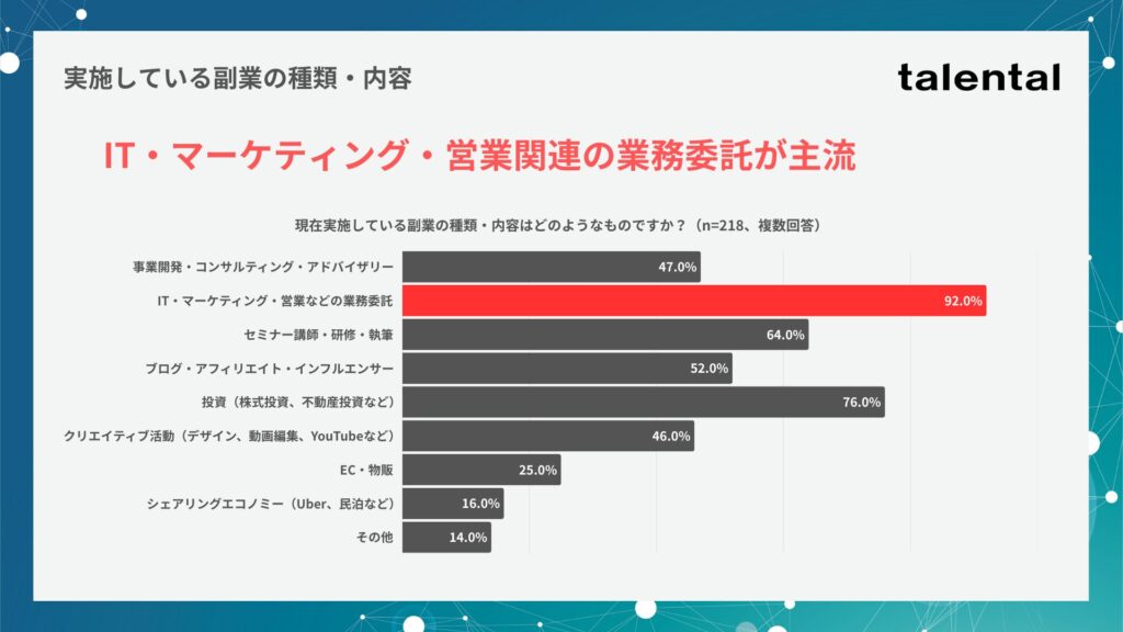実施している副業の種類・内容については、以下の通り、「IT・マーケティング・営業などの業務委託」がメインとなっています。