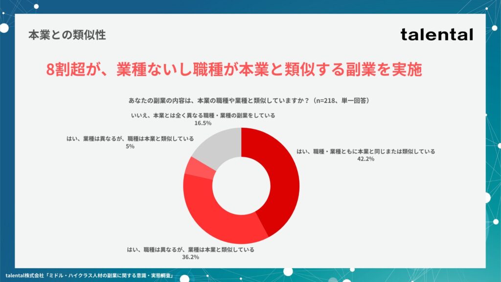 また、本業との類似性について聞いたところ、8割超が本業と業種もしくは職種のいずれが類似しているという結果になりました。
