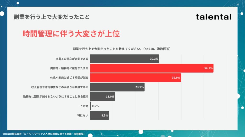 副業を通じて得られたメリットについては、「収入が増えた」「新しいスキルが身についた」「本業に活かせる知識・スキルが増えた」が上位に来る一方で、大変だったことについては「肉体的・精神的に疲労がたまる」「休息や家族と過ごす時間が減る」という時間管理の大変さが浮き彫りとなっています。