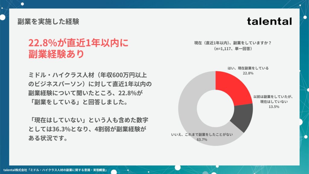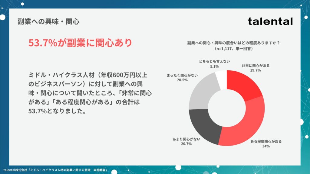 それから7年が経った2025年現在、ビジネスパーソンの副業に対する意識や実態はどのように変化しているのでしょうか。BizDev(事業開発)領域に特化した副業人材のレンタルサービスを手掛けるtalental株式会社では、年収600万円以上のミドル・ハイクラス人材を対象に、副業に関する意識や実態について調査しました。