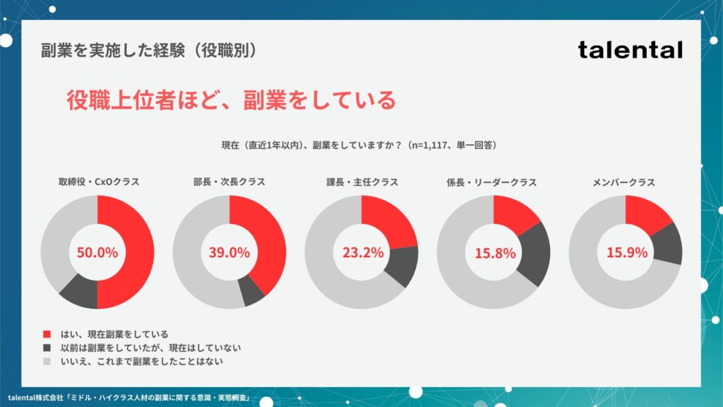 興味深い点として、役職上位者ほど副業を実施している割合が高いという結果が出ております。