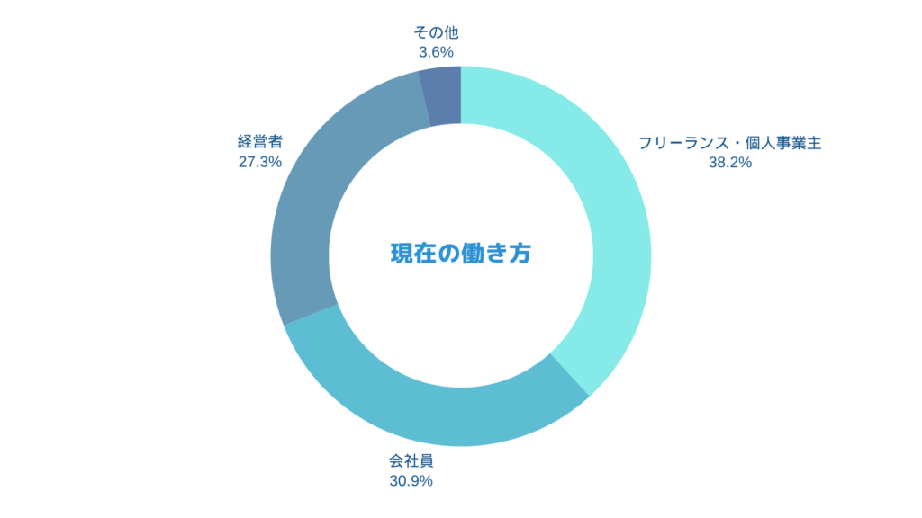 フリーランス・個人事業主、会社員、経営者がほぼ同じ割合で在籍しておりますが、前回よりは少しフリーランス比率が上がってきました。