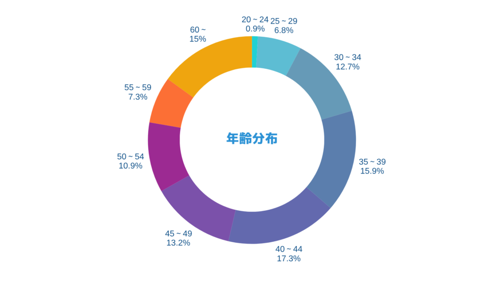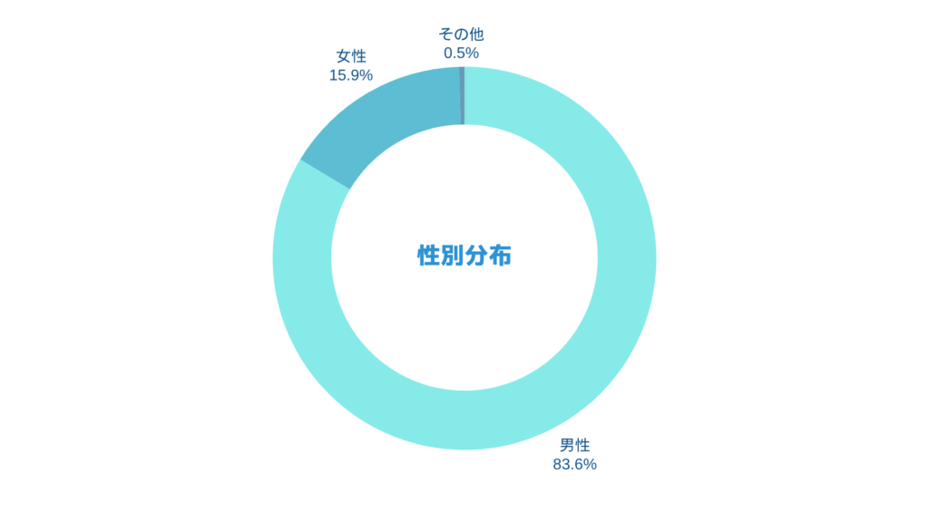 まずは年齢分布と性別分布から見ていきましょう。メイン属性となる30代・40代は全体の約6割。以前よりも20代の若年層や、50代以上のシニア層の登録も増え、年齢のバリエーションが広がってきました。性別分布では男性比率が引き続き8割強と高いものの、徐々に女性の登録も増えてきております。