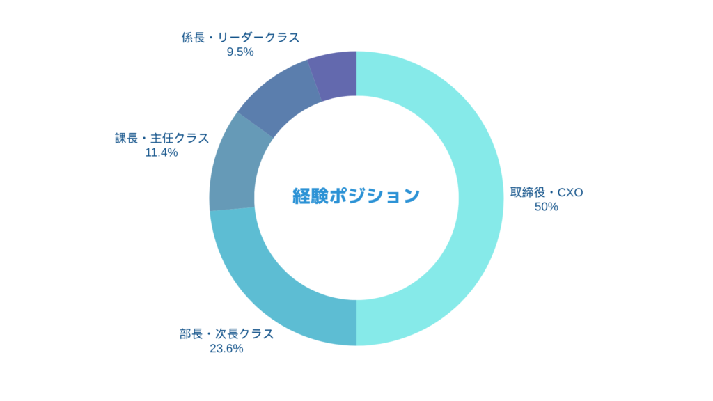 経験ポジションは「取締役・CxO」がちょうど50%、「部長・次長クラス」を含めると73.6%がいわゆるマネジメントレイヤーの経験者となり、経営視点を持ち合わせた人材が多いのが、talentalの一番の特徴となっています。