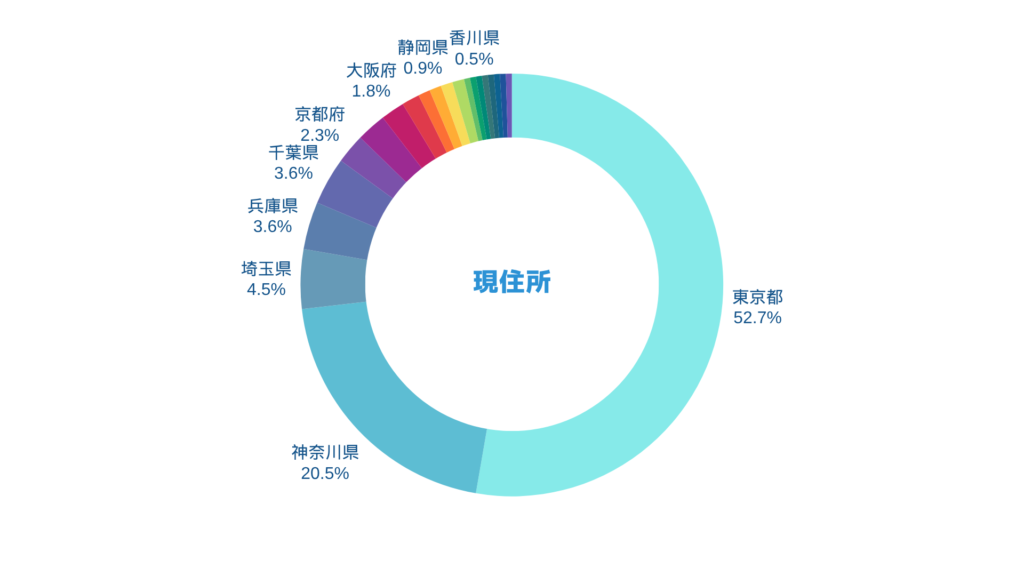 最後に、今回はじめてお出しする、現住所の分布です。「東京都」が52.7%、次いで「神奈川県」が20.5%、「埼玉県」が4.5%、「千葉県」が3.6%と、1都3県が8割超となっています。