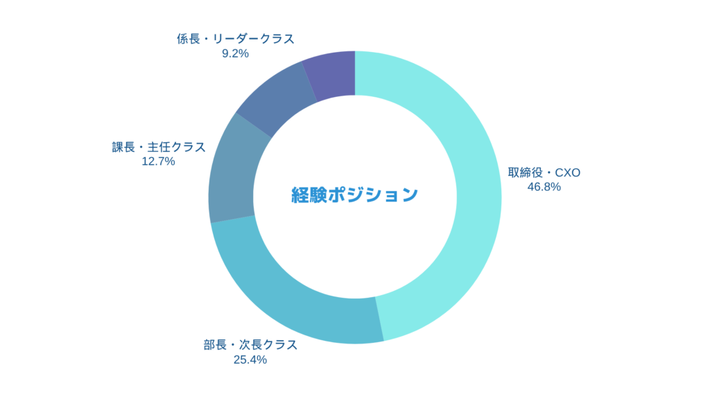経験ポジションがもっとも当社の特徴を表している点で、部長・次長クラスと取締役・CxOクラスを合わせて72.2%となっており、4分の3近くがマネジメントレイヤー経験者であるところです。