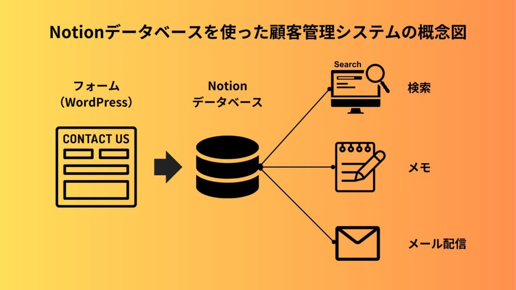 これを実装すると、Webサイト上のフォームに入力されたデータを、Notionのデータベースに自動で登録し、閲覧だけでなく検索やメモ、メール配信などを行うことができます。簡単に図にすると、以下のようになります。